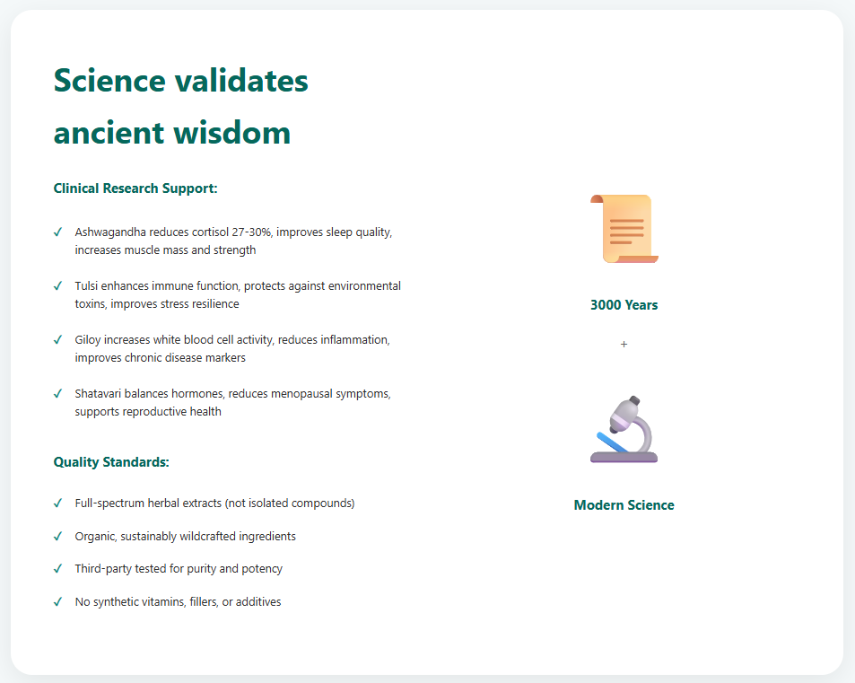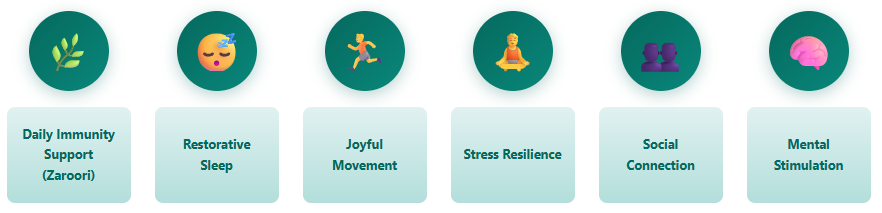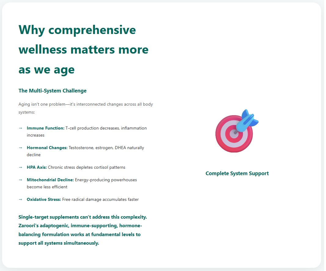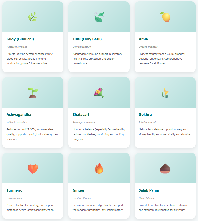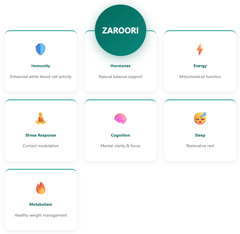 Experience Zaroori Masala (“Essential” in Hindi), our most comprehensive Ayurvedic formulation supporting immunity, energy, hormonal balance, stress resilience, and multi-system vitality. As we age, our bodies require deeper nourishment to maintain the vibrant health we deserve. Zaroori provides daily immunity support while building ojas (vital essence)—the foundation of graceful, active aging.