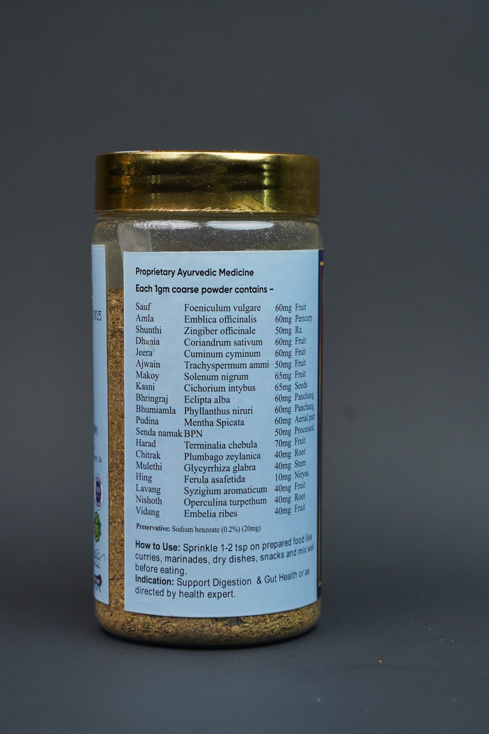 Important ingredients: Ginger, Cumin, Cinnamon, Ajwain, Cloves, hing, M akoy, Kasnee, Bhringraj, Bhumi amla, Patol Patra, Harad, Mulethi, Oregano