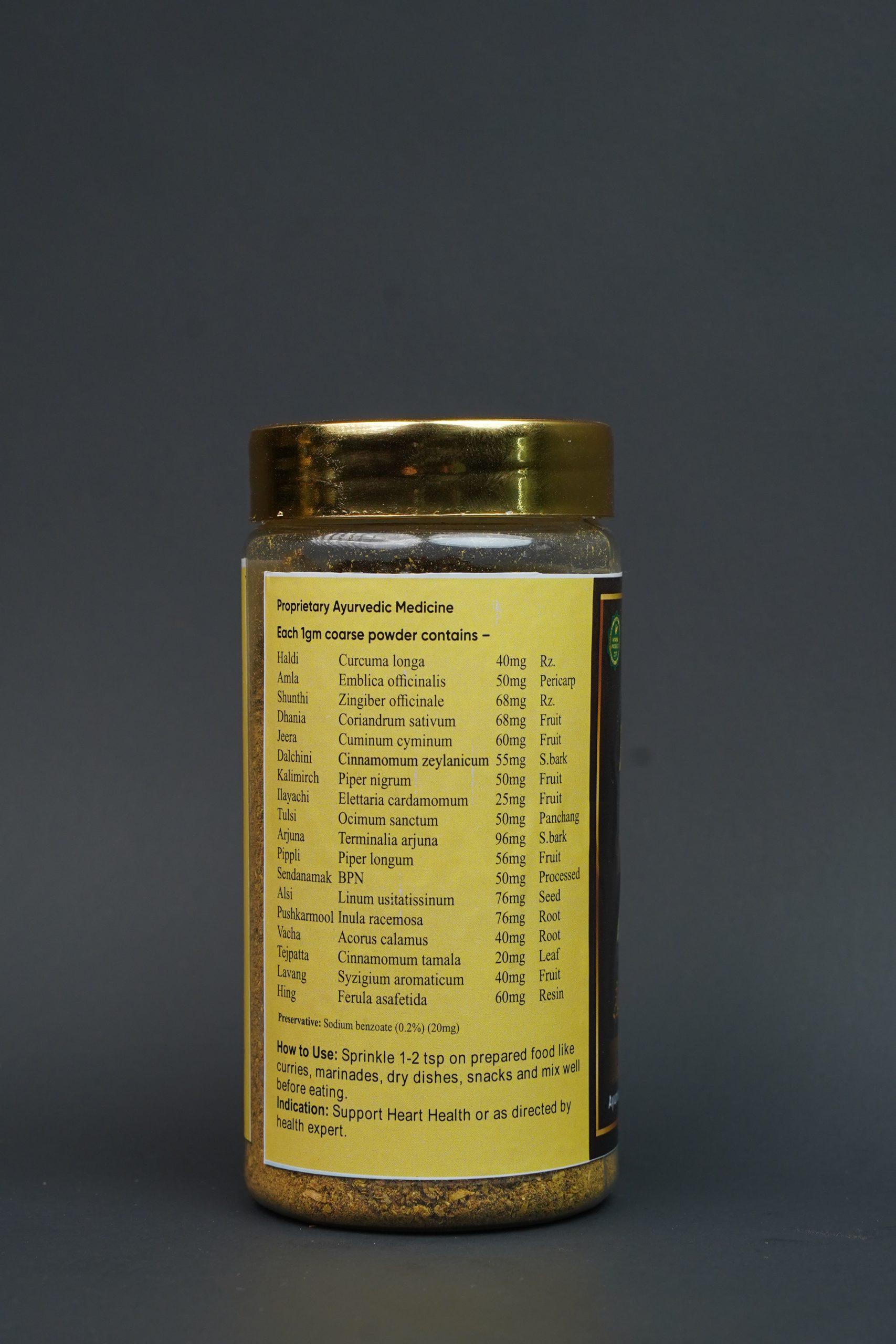 Important ingredients: Ginger, Cumin, Cinnamon, Black Pepper, hing, Peepal, Turmeric, Cloves, Arjuna, Flax Seeds, Pushkarmool, Vacha, Amla, Tulsi.
