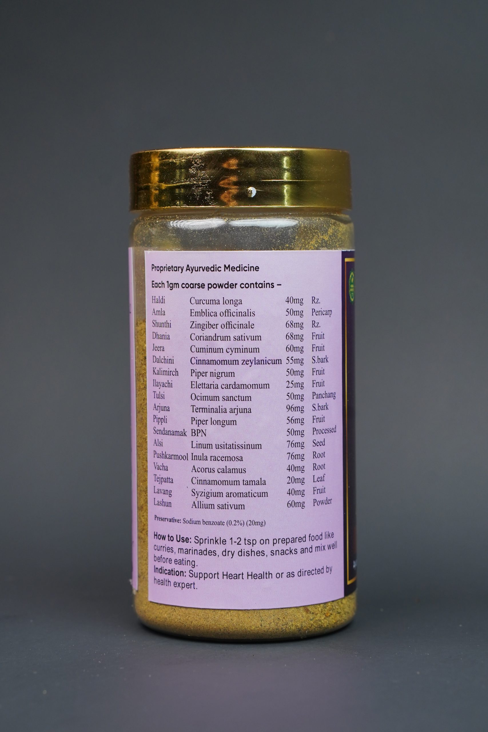 Important ingredients: Ginger, Cumin, Cinnamon, Black Pepper, Peepal, Turmeric, Cloves, Arjuna, Flax Seeds, Pushkarmool, Vacha, Garlic, Amla, Tulsi.